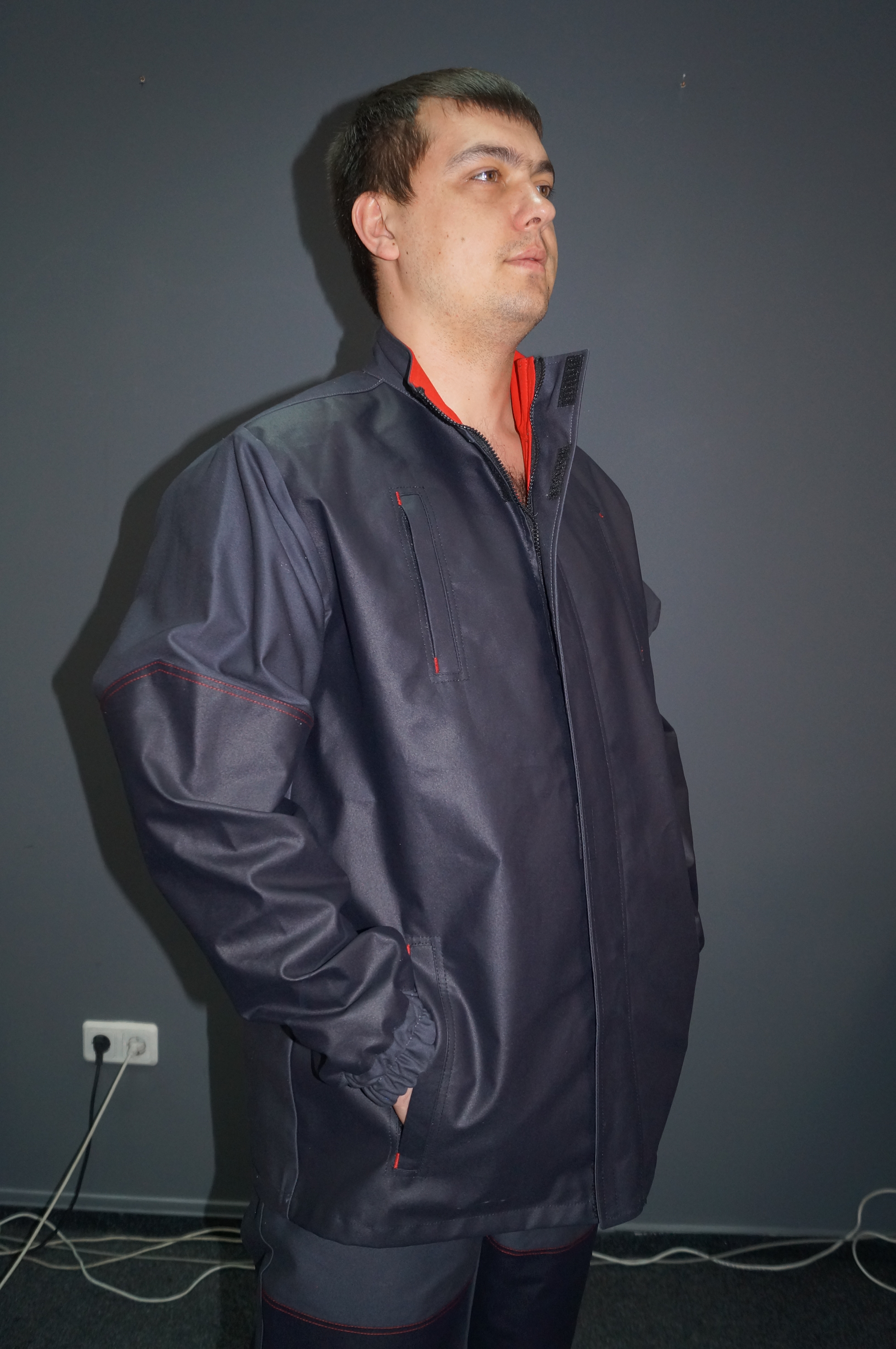 Jacket: straight cut in gray fire-resistant fabric with black patch inserts on the sleeves and front panels.